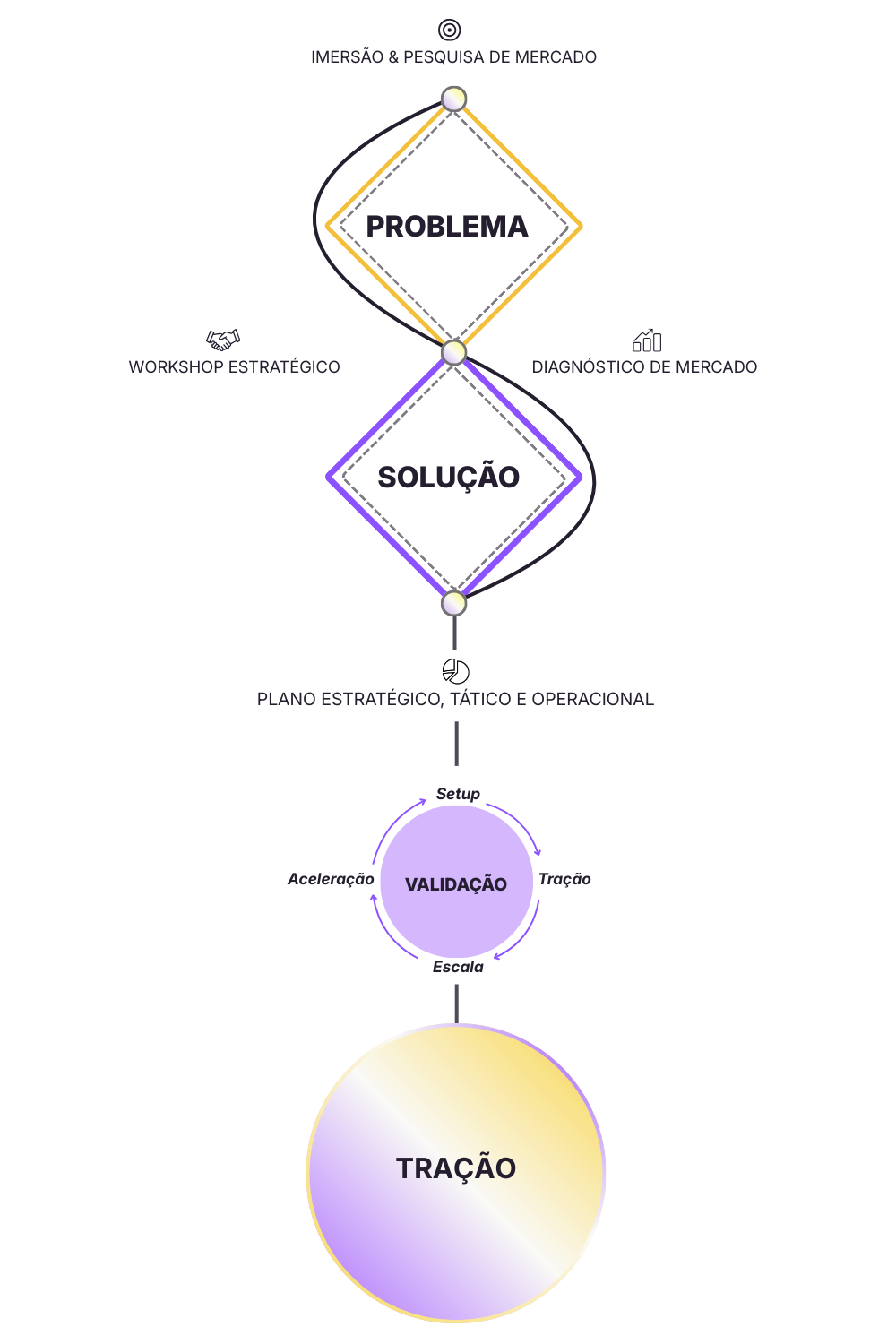 Pesquisa de mercado e comportamento, workshop de estratégia, protótipo e validação de mercado.